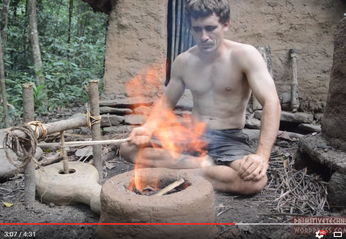 影片中,原始神人在幾根樹枝中升起了火堆,雖然用樹皮搧風讓火勢暫時變大,但他希望有個能將風向準確帶往火堆的設備,便用2片樹皮做成可以手動旋轉的風扇,再用泥土做出有個長長出風口的風罩。設備到此已能確保風力送到火堆,但神人繼續將設備升級,加上省力裝置,只要拉動繩索就能轉動風扇,最後再用泥土圍起火堆,僅留下上面的燒烤處和側邊的進風口。