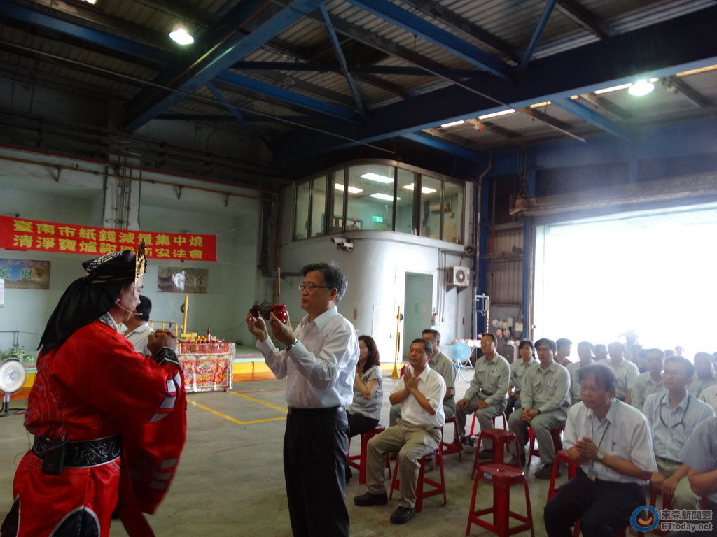 農曆7月將屆,台南市環保局推動中元普渡紙錢集中燒政策,1日上午在城西焚化廠舉行淨化寶爐儀式,台南市環保局長李賢衞率同仁,隨和意堂資深小法道長完成淨爐科儀,呼籲市民將普渡紙錢交由環保局運至焚化爐焚燒,共同維護空氣品質。