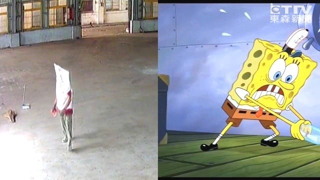 工廠老闆黃先生說,「他現在小偷的裝扮,都套著布袋,旁邊剪兩個洞,手伸出來,就是一個偽裝的工具,畫面看起來像不像海綿寶寶?」這間工廠還沒開始營業就已經屢遭小偷光顧,調閱監視器發現,竊嫌為撥開監視器鏡頭又怕被拍到,特別把衣服撩起來蓋住自己,老闆看了又好氣又好笑。