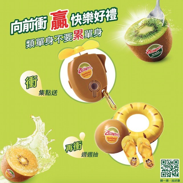 活動期間凡於全家便利商店購買Zespri奇異果,包裝內附贈1組編碼,於活動網站上登入編碼,即可參加此活動。集滿14組編碼,即可兌換「陽光金圓頭水風扇」一個,集滿28組,兌換2個,以此類推。再加碼週週抽5名奇異果限量好禮,讓奇異果沙灘拖鞋、泳圈、沙灘球,陪你酷玩一夏。詳情請上活動網站https://bit.ly/29VdI6t
