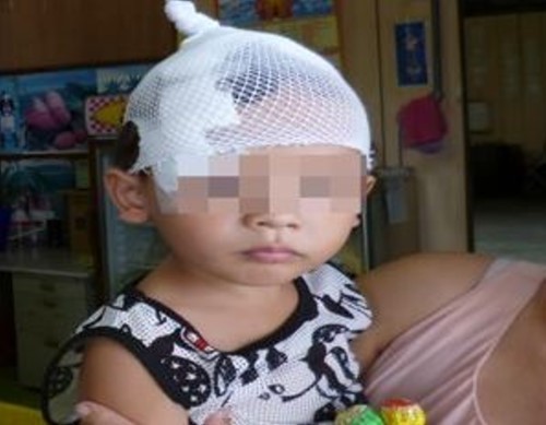▲3歲男童頭部縫了15針,所幸經過治療後已無大礙。(圖/苗栗縣動物保護防疫所)