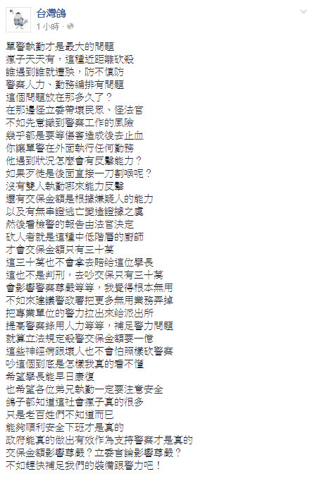 台灣鴿沉痛地表示,單警執勤才是最大的問題,瘋子天天有,這種近距離砍殺,誰遇到誰就遭殃,沒有雙人執勤哪來能力反擊,「警察人力、勤務編排有問題,這個問題放在那多久了?」