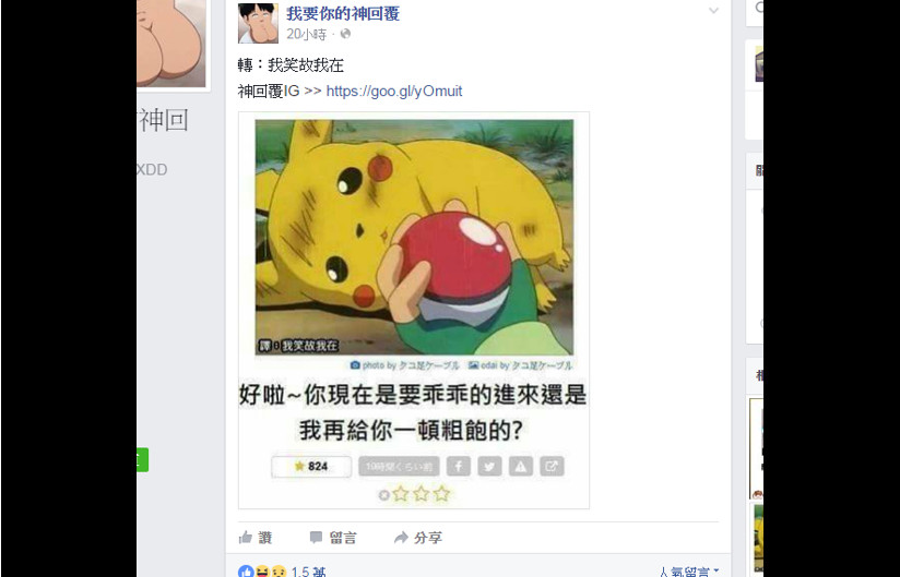 原圖應該是皮卡丘剛戰鬥完,全身都是傷,小智非常不捨拿出寶貝球要它進去休息的感人畫面,但是被網友在圖片下方加入了一段註解,「好啦~你現在是要乖乖的進來還是我再給你一噸粗飽的?」KUSO成好像皮卡丘剛被小智霸凌完一樣,整個完全變調,樓下的留言也相當的爆笑,有網友貼出小智與皮卡丘臉部互換或是兩個都變成超級肌肉男戶尬的圖片。網友看完後紛紛笑說:「 這樓留言好87阿」、「哈哈這樓是殺小啊」、「本來很感人的劇情,為什麼要崩壞我的童年!」、「洨丘與屁卡痔」,甚至有網友直接貼上動保法條例被讚翻。