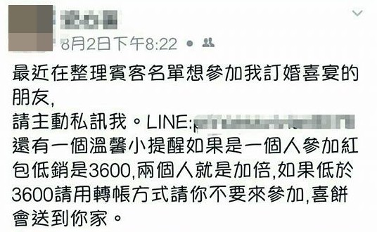 參加婚宴還有低消?一名女網友在臉書PO文表示,近日在整理訂婚喜宴的賓客名單,要「想參加的朋友」主動加LINE私訊,此外,她還特地寫下「溫馨小提醒」,訂下一個人參加紅包禮金3600元的低消,讓網友相當傻眼,將這篇奇文擷下轉PO到「爆料公社」。