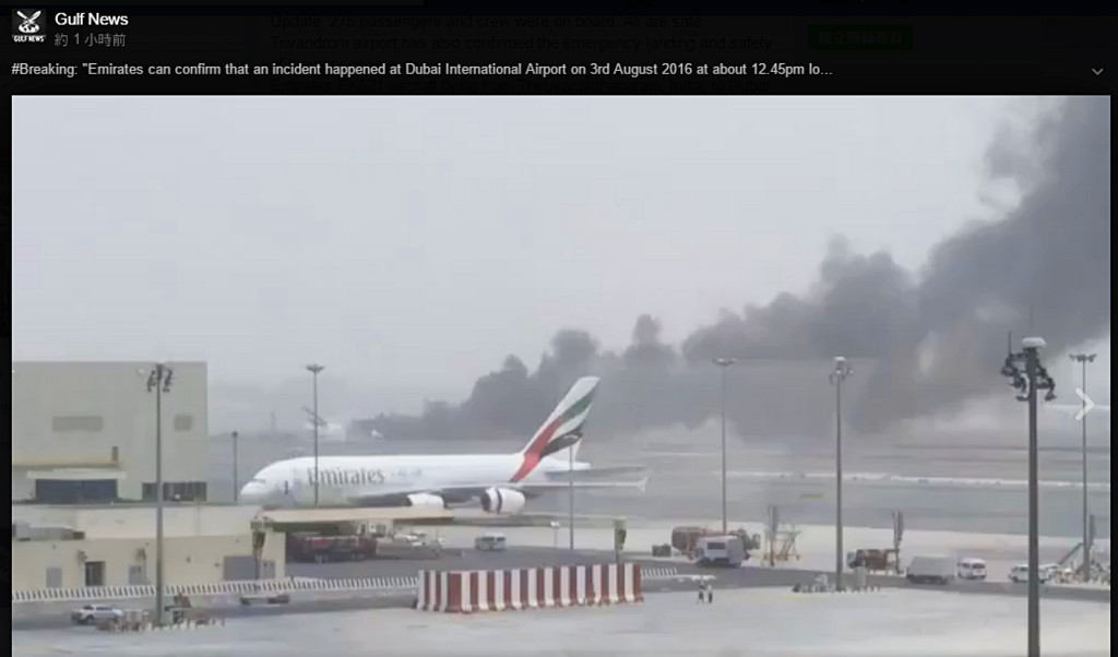 阿聯酋航空(Emirates)於杜拜國際機場當地時間3日下午緊急迫降,被拍到在跑道上起火,冒出濃濃黑煙,相關工作人員緊急疏散,將乘客等機上人員帶至安全地區。航空公司證實,機上282名乘客和18機組人員無人傷亡,同時杜拜機場的出境班機恐將受影響延遲。