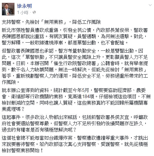板橋警員張家逢取締違停慘遭追砍事件,引發社會關注。時代力量立委徐永明4日於臉書上發文,他指出,一般取締違規都是單警出動,安全風險高,唯有先檢討「無用業務」,才能解決員警人力不足問題。