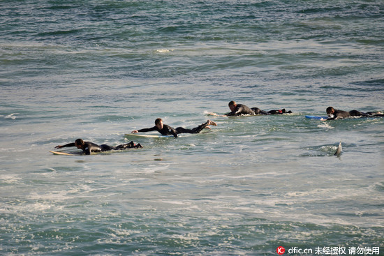 ▲遇到鯊魚「伴游」,衝浪手嚇得逃離現場。(圖/東方IC)