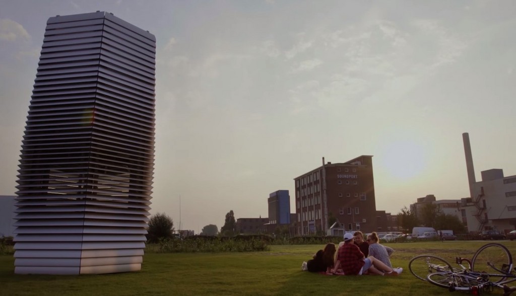 荷蘭1名36歲設計師丹•羅斯格德(Daan Roosegaarde)發明1款名為「除霾塔」的巨大戶外清淨機,據悉能夠吸入霧霾,過濾有害物質,排出淨化後的空氣,而「除霾塔」所提取的碳顆粒,還能封存至壓克力中,製成特別的小戒指及袖釦等產品販售。