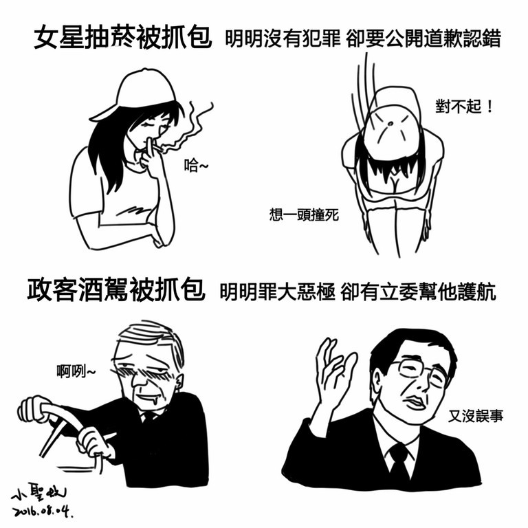 知名插畫家「小聖蚊的治國日記」4日發表「阿喜哈菸遭抓包,臉書鞠躬致歉」對比「江春男酒駕,黃偉哲:沒誤事不需撤換」插畫,感慨發問「我都不知道這些人的道德標準到底是怎麼了...」,引發網友熱議,直呼「真正的偶像是不食人間煙火的,真正的政客是會消滅負面新聞」、「偷拍的沒事,被偷拍的要道歉!好奇怪的邏輯。」