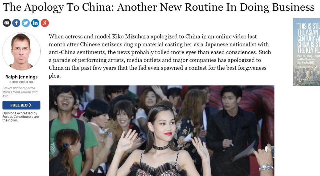 上個月日本女演員兼模特兒水原希子在線上為自己有反華情緒向中國道歉,台灣藝人周子瑜在年初也因為在節目上揮舞台灣國旗,而公開向中國道歉,不只如此,近年不少大型企業也對中國低頭,甚至演變了一場寬恕的競賽,《富比士》雙週刊認為,在中國做生意,不容許違反共產黨立場,得要學會道歉才行。