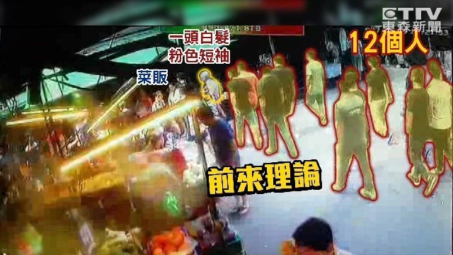 12名男子浩浩蕩蕩走進菜市場內,劈頭就是一連串髒話,後方還有人摩拳擦掌在「熱身」,看起來火藥味十足,嚇壞不少買菜的民眾。目擊者指出,這群男子走到菜販攤前就開始理論,口氣相當火爆,附近民眾見狀趕忙閃躲、報警求援。
