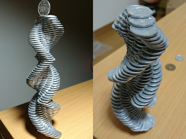 而他馬上又有新作品,在8月6日深夜,他運用1圓硬幣開始搭建一座「旋轉建物」,為取信網友,還先放上半成品,最後放上完成品,讓人驚訝。