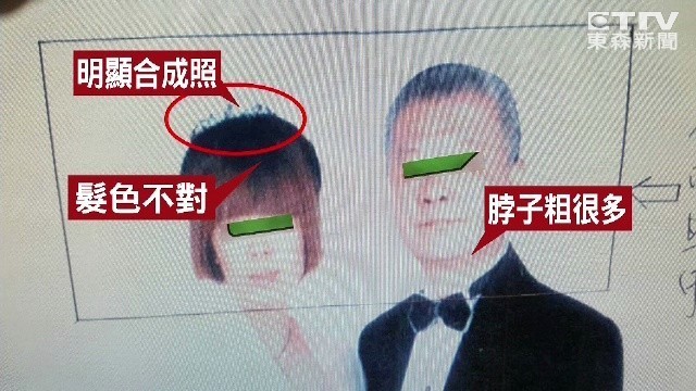 拿出婚紗照大秀甜蜜,但照片卻愈看愈怪,移民署屏東縣專勤隊隊長陳駿璿說,「人頭接這個制式的西裝照片,女孩子也是一樣」,仔細一看還真的有些不對勁,照片中的男女不僅擺出的姿勢不協調,脖子比例也不對。