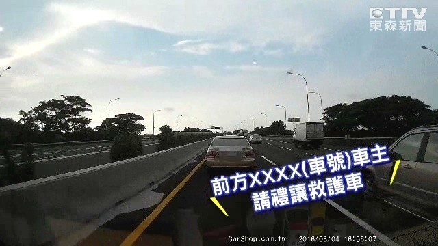 這起事件發生在4日,救護車行駛在內側車道,儘管已鳴笛、按喇叭,甚至廣播車牌警示,「前方XXXX車主請禮讓救護車」,但前方轎車就是置之不理;過了約3分鐘,女消防員只好先切到中線,超越轎車後再切回內線。