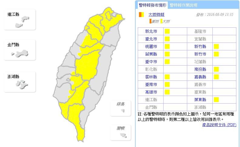 受到午後對流旺盛影響,氣象局針對全台13縣市發布大雨特報,警戒縣市有新北市、台北市、桃園市、苗栗縣、新竹縣、新竹縣、台中市、南投縣、雲林縣、嘉義縣、台南市、高雄市以及屏東縣,提醒民眾注意大雨與雷擊。