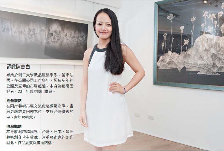 現在的穎川畫廊,在東方文化的大方向下已獨家代理到不少十分具備市場潛力的年輕華人藝術家,近一、兩年大陸藝術市場的蓬勃,也讓陳慕白觀察到兩岸藝術市場不同的風向。她提到,大陸的畫廊比較善於炒作藝術家,但台灣卻因為有文化的底蘊,而使藝術品的價值相對穩定發展,目前雖不排除經營中國藝術家,但終究還是以台灣藝術家為主,「先讓他們在這個島上站住腳。」