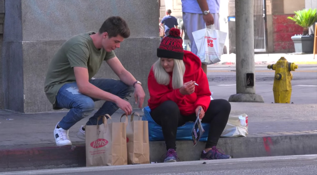 ▲美國YouTube名人Brooke Roberts日前錄製分送食物給流浪漢的影片,卻意外讓一家三口團圓!(圖/翻攝自YouTube,以下同)