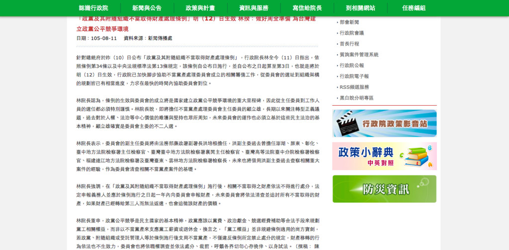 ▲行政院11日發布林全針對處理黨產措辭強硬的新聞稿。(圖/取自政院網站)