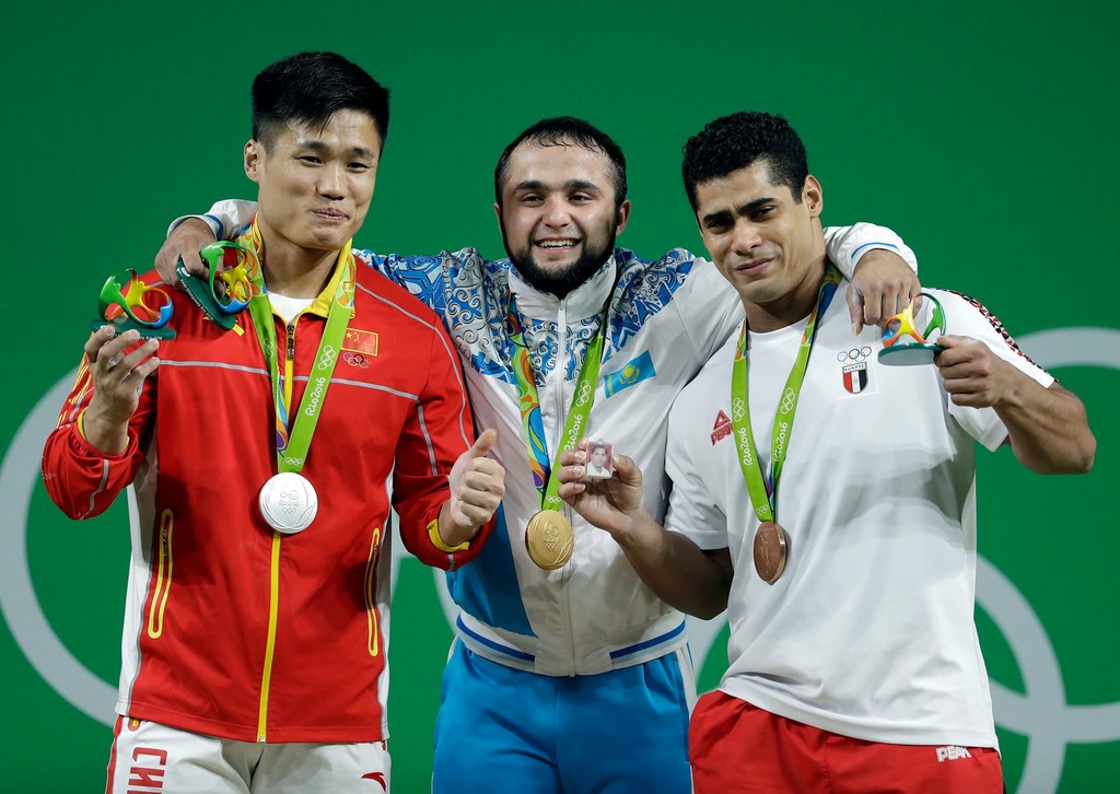 ▲男子舉重77公斤級比賽,呂小軍(左)獲亞軍,哈薩克選手拉希莫夫(中)奪金牌。(圖/達志影像/美聯社)