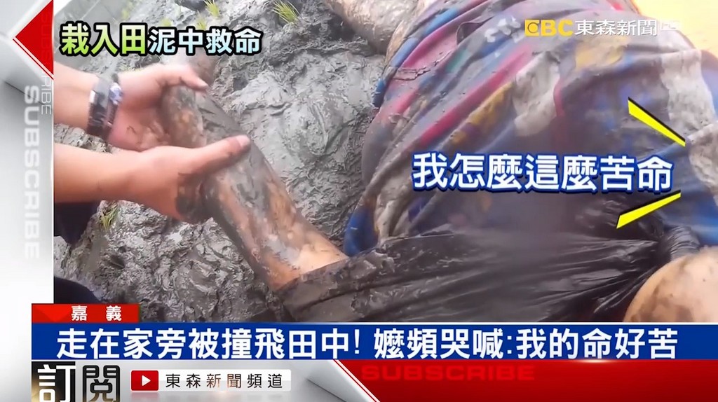 ▲阿嬤被撞進水田中,不斷哭喊「我怎麼這麼歹命」。(圖/東森新聞,下同)