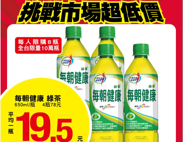 迎戰中元檔期黃金周末採購人潮,全聯連三天祭出超特惠飲料商品,其中挑戰市場最低價的每朝健康綠茶,竟然4瓶只要78元,等於一瓶換算下來只要19.5元,且全台限量10萬瓶,勢必引發搶購人潮。