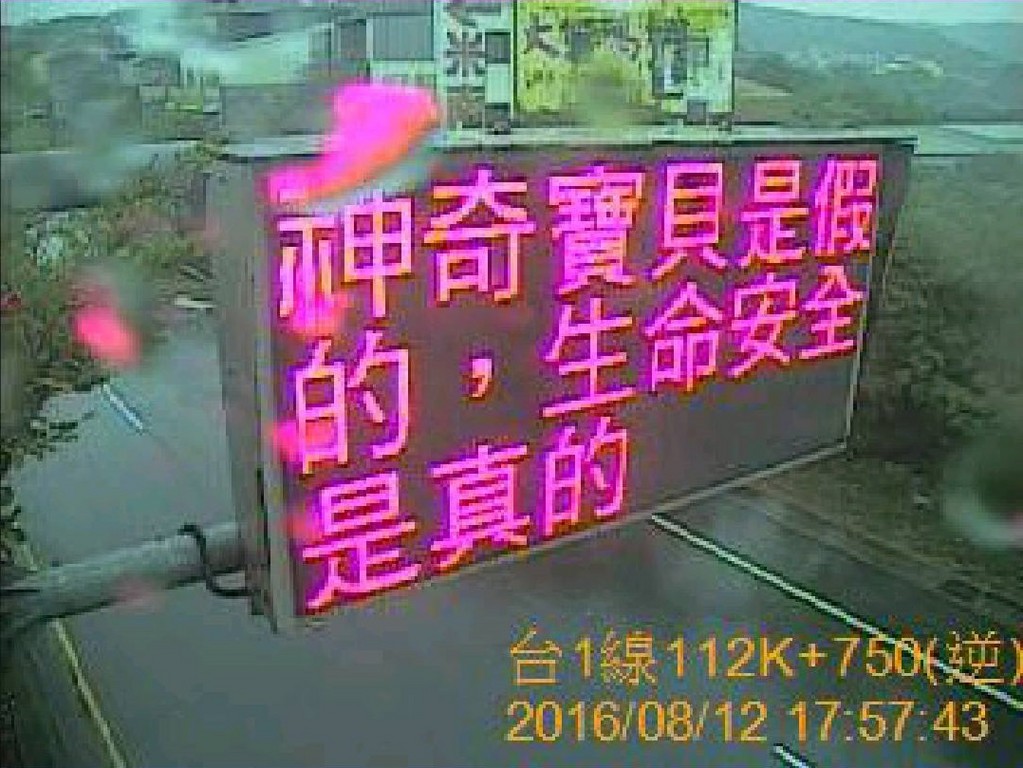 有網友發現,在台一線苗栗後龍段的CMS資訊顯示看板上,都打出了「神奇寶貝是假的,生命安全是真的」的字樣,《ETtoday》實際透過省道即時交通資訊網查詢,苗栗縣境內包括台3線、台61線、台72線的資訊看板都顯示相同訊息,不但令人會心一笑,也感嘆一個遊戲的力量竟如此強大。