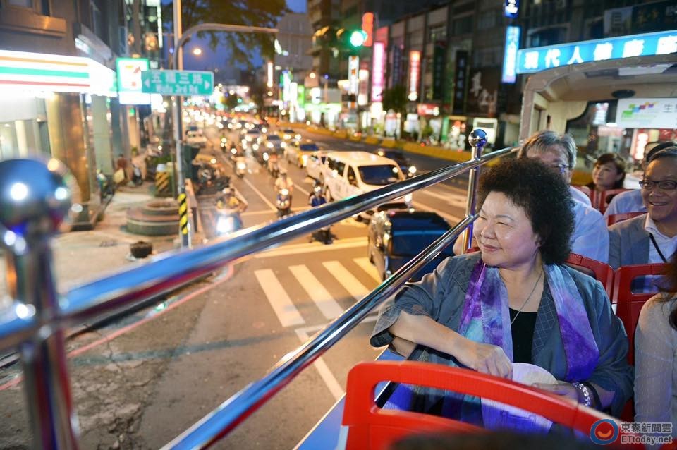 高雄市以領先全國之姿引進開頂雙層觀光巴士後,因新穎鮮豔外型,開放式車體讓高雄風光一覽無遺,自上路後便吸引不少遊客圍觀搶搭。乘著12日傍晚的徐徐涼風,高雄市長陳菊也親自上車試乘,沿途欣賞港都街景和夜色,她讚嘆高雄越夜越美麗,同時也歡迎民眾搭乘體驗,用不同高度感受高雄迷人風采。
