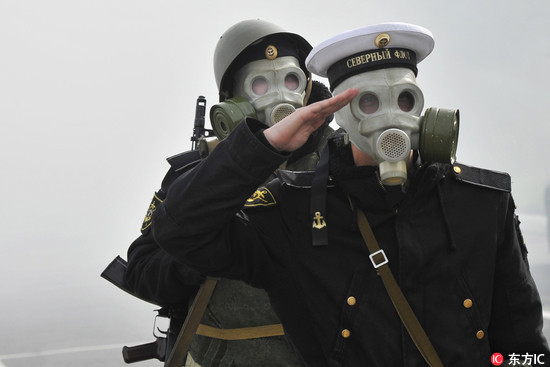 ▲俄羅斯生化部隊在北海艦隊的艦艇上製造煙霧。(圖/東方IC/下同)