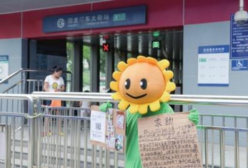 廣東河源的鄒姓爸爸為了給患重病的兒子籌醫藥費,大熱天裡在北京街頭穿向日葵的服裝求合照。他們治療前期已花費台幣約230多萬,後續至少還要花90幾萬,鄒爸表示,「雖然有些不少意思,但為了孩子,再多的苦我也願意吃」。