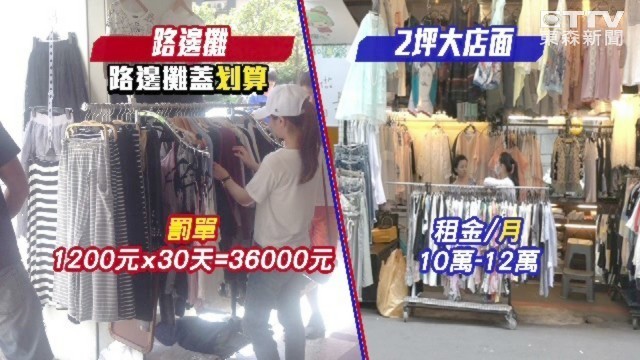 台北市東區街頭常可見賣衣服的攤販,若被警察取締一次開罰1200元到2400元,罰單不便宜,但仍全擠在捷運出口附近擺攤;因東區小小2坪店面租金可超過10萬元,讓利潤本來就不多的服飾業者,選擇在路邊擺攤,就算連收30天罰單也比租金便宜。