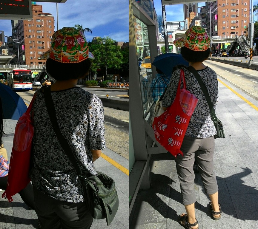 鄉民kise7ryota在PTT上分享這組照片,並說自己一大早頂著大太陽走到公車站等車,沒想到竟看到眼前一名女子竟「把純喫茶的盒子做成帽子」,讓他直誇「實在是太有才、手太巧了!!!小魯佩服的五體投地Orz」