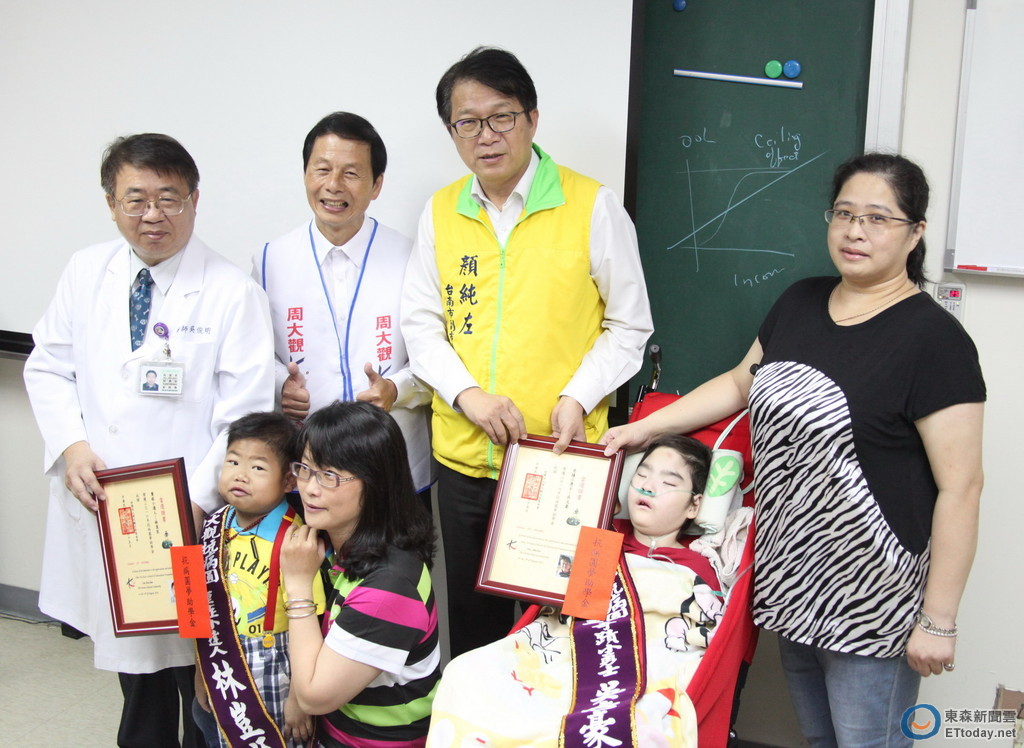 8歲的吳志豪同學和12歲的林豈臣同學,因重症多次進出成大醫院加護病房,在療團隊全力搶救照顧下,通過重重關卡展現強烈的求生勇氣,永不放棄的精神,獲得2016年周大觀抗病圓夢助學金,頒獎典禮15日在4C病房舉行,台南市副市長顏純左、成大醫院吳俊明副院長、周大觀文教基金會創辦人周進華都到場替兩位生命小勇士加油。