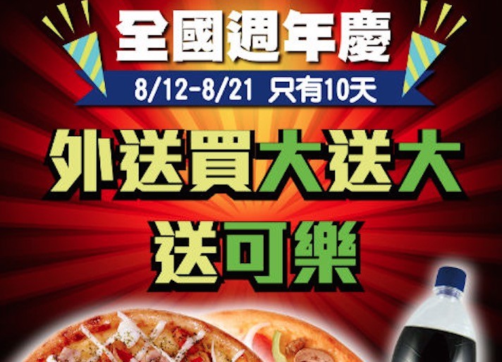 「達美樂」在台灣啟動為期10天的周年慶活動,強調披薩外送專家優勢,將原先深受消費者喜愛的外帶買大送大的優惠升級,全台門市即日起提供免費"外送"服務,"買大送大送到家,夏日炎炎再加碼送1.25L 可樂1瓶,要讓消費者好吃又消暑!