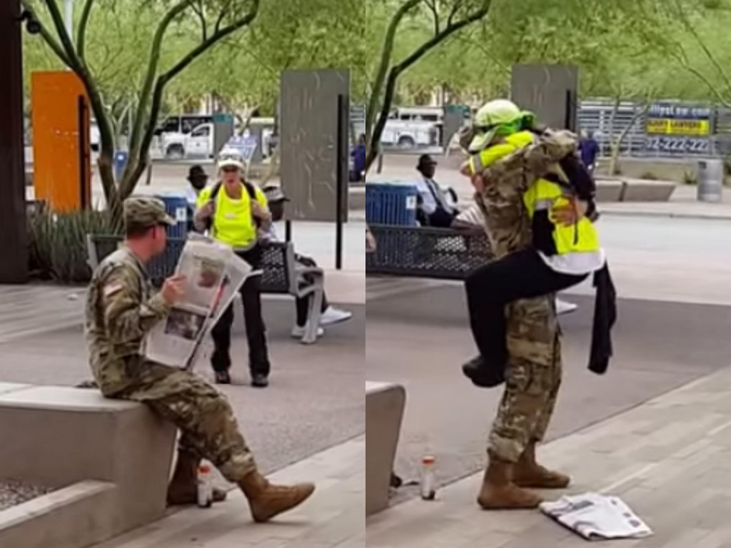 美國大兵Larry說「我跟我媽說7月底才能回到家,而我整整提早一個月,就是要給她一個大驚喜!」他穿著軍服、坐在媽媽工作的地方低頭看著報紙,而穿著黃色衣服的媽媽走過他身旁時,好奇的看了幾眼,沒想到自己的兒子就坐在這裡!