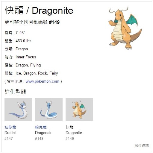 ▲在搜尋功能打上「快龍」、「快龍 英文」、「Dragonite」、「Dragonite 中文」或是「寶可夢 149」等關鍵字,頁面就會立刻顯示該寶可夢的特性。(圖/翻攝自Yahoo奇摩)