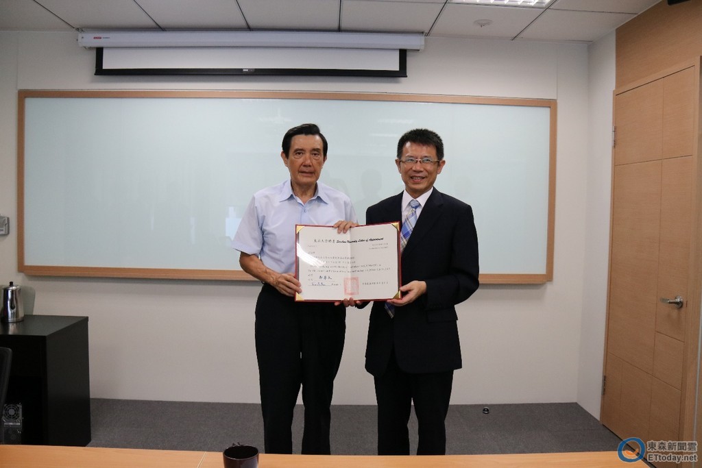▲潘維大校長致送馬前總統東吳大學嚴家淦法學講座教授聘書(圖/東吳大學提供)
