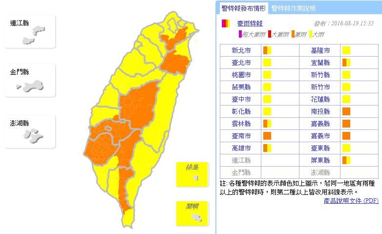 對流雲系發展旺盛,氣象局不斷擴大豪、大雨特報範圍,下午15時35分,除了連江縣、金門縣以及澎湖縣之外,全台19縣市全納入警特報區域。