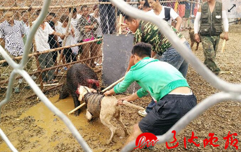 遼寧撫順市鬥獸場昨日上演「群狗戰野豬」戲碼,圍觀群眾喊著「衝啊!咬死他」,獵犬們紛紛包圍住野豬狠咬,總共歷時2小時,最終斃命。不管大人小孩,每人只要10元人民幣(約50台幣)即可入場,工作人員吆喝著,「即將激情上演一場血腥的殺戮,點燃每位觀眾的熱情,釋放出每位男兒的陽剛本性」,向群眾招攬生意,許多大人帶著學齡前的小孩們參加,現場也有挺著大肚子的孕婦。