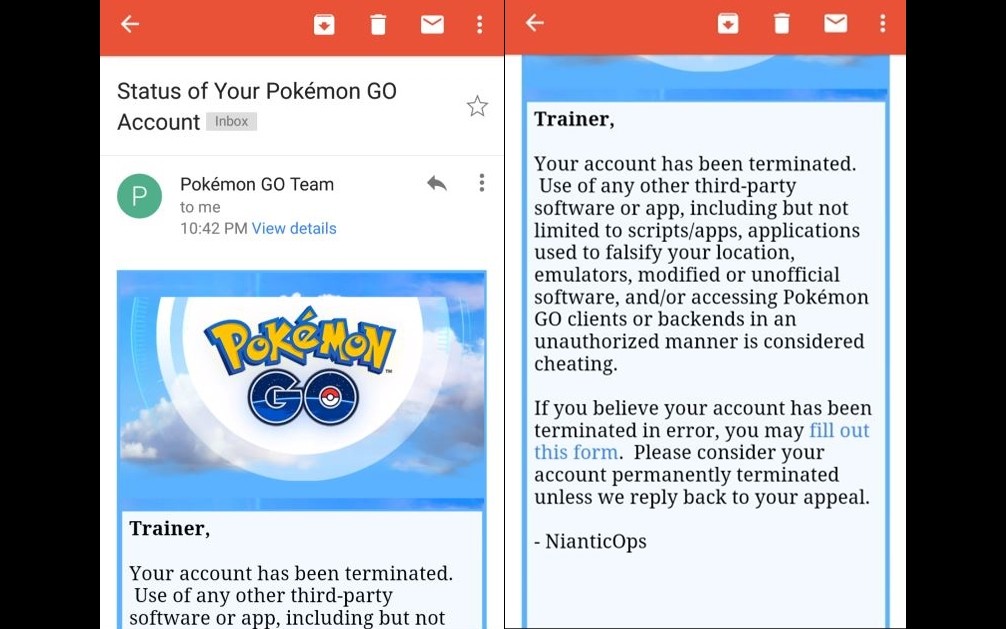 署名Pokemon GO Team寄出的停權通知全文如下: