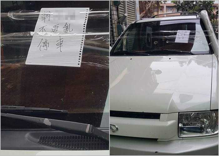 網友在「爆廢公社二館」po文說,「就是有腦殘的車主愛亂停車,打給警察,警察說有聯絡車主,但是過了一小時都沒來。我只好留個字條給車主囉,為了怕字條飛走,我很小心翼翼的繞了車身好幾圈,才把字條固定好,希望車主能了解我的用心。」只見他寫了「XXX不要亂停車」用膠帶繞好幾圈,貼在擋風玻璃上。