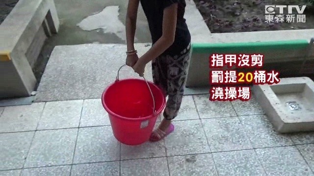 大水桶裡,裝了超過一半的水,10歲小女童提起來才走沒幾步,已經氣喘如牛,水桶加上水重量約有五公斤,小女童得來回提20桶,每回從教室到操場,大約需走50公尺,只因為指甲沒剪,就被受到重罰,提及為何不向老師告知自己會喘,女童說因為自己怕被老師罵。