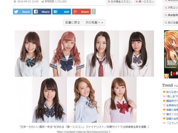 誰是日本最可愛的高中生呢?今年度的高一「Miss Contest」票選活動,經過7天的投票後,最後有7名高一女生入選,名單分別是中町綾、原菜知、佐藤華佳、伊藤夏音、志村朱里、鳥羽田朱李和水上幸步。