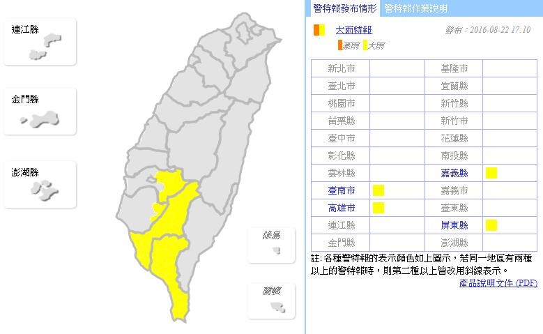 受到午後對流雲系發展旺盛影響,易出現短時強降雨,中央氣象局22日下午17時10分,針對高雄、屏東屏地區以及嘉義、台南山區發布「大雨特報」。氣象局提醒,大雨特報地區有局部大雨發生的機率,民眾也要注意雷擊及強陣風。