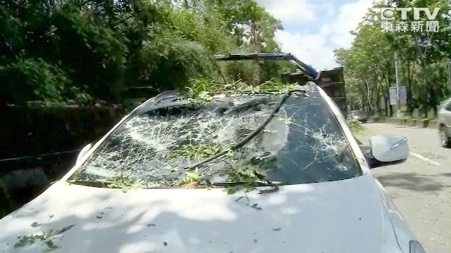 ▲休旅車的車頂被樹木砸凹,擋風玻璃也裂成蜘蛛網狀。(圖/東森新聞,下同)