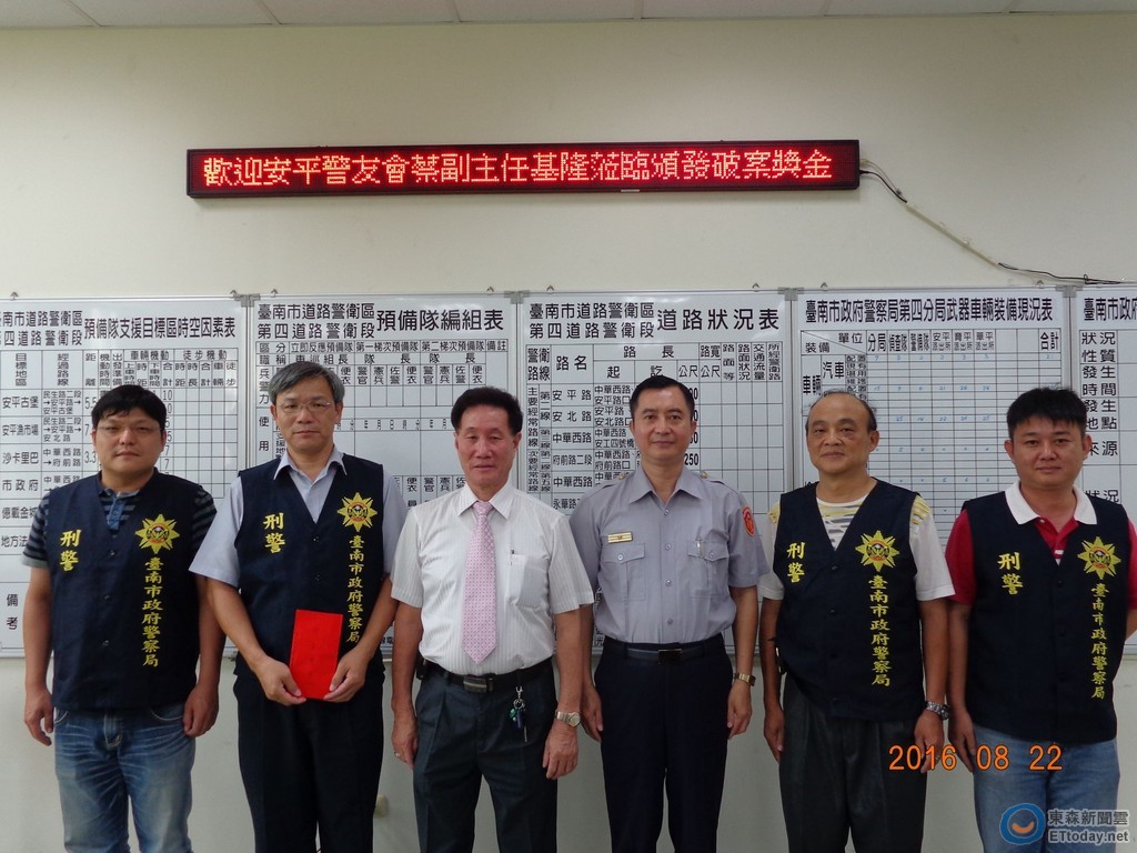 台南市警友會安平區辦事處主任邱讚霖等人,體恤市警四分局員警為治安打拼的辛勞,特利用週報機會,表揚第四分局於8月18日偵破轄內運河路槍擊案,起獲犯案突擊步槍1支,由安平區警友辦事處副主任蔡基隆、杜有利、委員張國釧、方炳堂、秘書劉金德等5人,代表該會頒發破案獎金3萬元,鼓勵員警提升士氣。