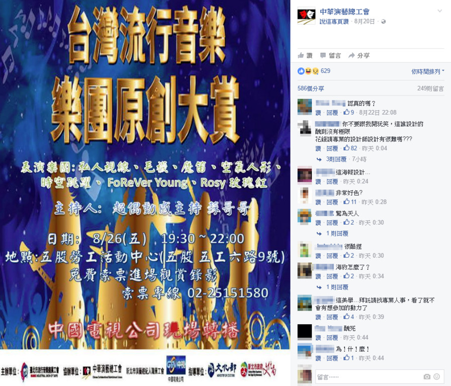▲有網友認為海報設計不夠專業,但也有人認為宣傳效果不錯。(圖/翻攝自中華演藝總工會粉絲專頁)