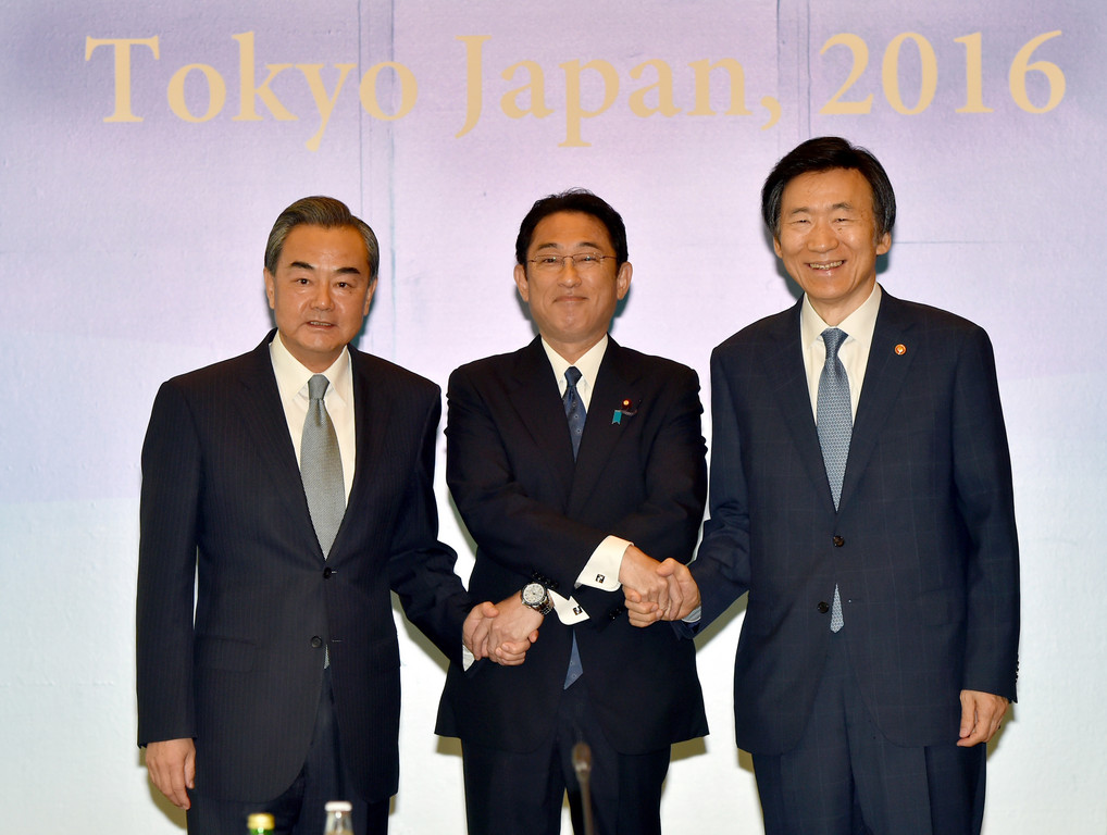 ▲中國外長王毅(圖左)、日本外長岸田文雄、南韓外長尹炳世。(圖/達志影像/美聯社)