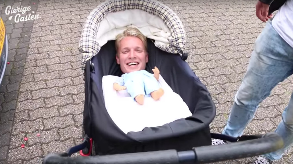 荷蘭搞笑二人組Gierige Gasten在9日上傳影片,要挑戰如何不買票進兒童樂園,先是去賣場購買嬰兒推車、改造,讓其中一位的身體能塞進去,外面鋪滿布料,只露出一顆頭,還放一個嬰兒娃娃的身體偽裝,接著就往售票口前進!
