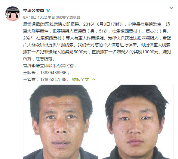 案發隔日(10),寧津縣公安局在官方微博上發布通緝令,懸賞51歲賈德勇和28歲賈志興歸案,抓獲一名犯罪嫌疑人,可獲1萬人民幣(約新台幣4.8萬元)獎勵。此外,警方表示「嫌犯凶残,注意防範」,對於犯案用的腐蝕性液體,則待送檢查證,暫時不方便透露。目前兩嫌自首歸案,案件審理中。