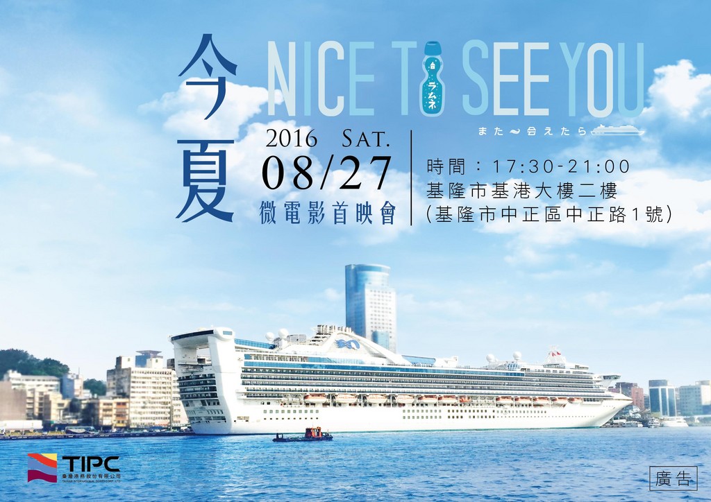 臺灣港務公司首部微電影「Nice to See You」以豪華郵輪為背景,串接兩代若有似無的異國戀曲。在預告篇播出後,造成不少迴響,究竟男女主角如何譜出郵輪戀曲?爺爺又有甚麼秘密?答案將於8月27日(六)下午5點30分,在基隆港基港大樓舉辦「今夏-NICE TO SEE YOU微電影首映會」中正式揭曉。
